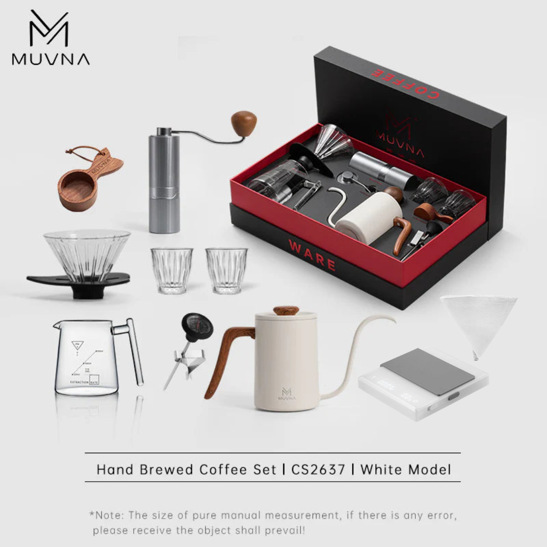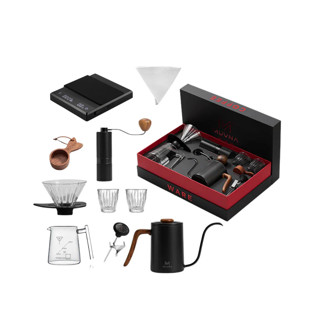 المحتويات الكاملة:ميزان إلكتروني، فلاتر، كوب للشرب ×2، مطحنة قهوة يدوية قابلة للتعديل، إبريق قهوة بوز رقبة الإوزة، كوب فلتر القهوة، طقم تحضير القهوة بالتنقيط (Pour Over)، موازين الحرارة، وملعقة قياس حبوب القهوة.