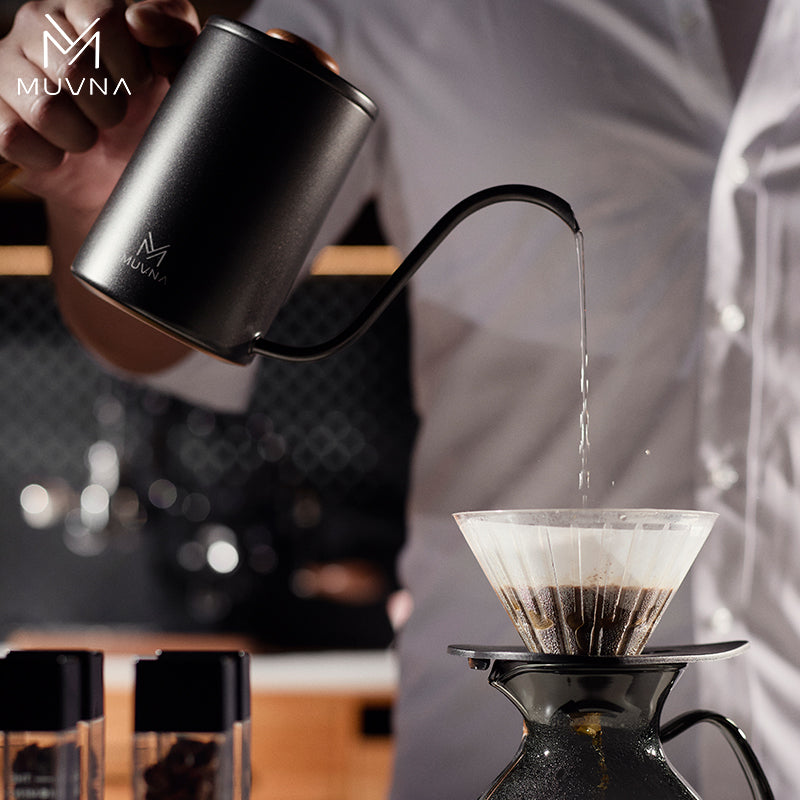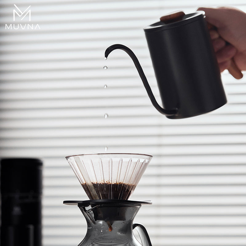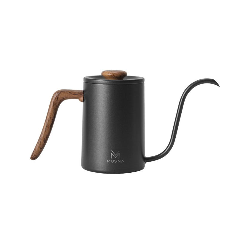 إبريق تحضير القهوة من MUVNA بتصميم أنيق وعصري مع لمسات خشبية جميلة. يتميز هذا الإبريق بخامة معدنية مطفية باللون الأسود، مع مقبض خشبي يضمن راحة الاستخدام والسيطرة الدقيقة أثناء صب الماء. يُعتبر هذا الإبريق الخيار المثالي لمحبي تحضير القهوة بأسلوب "السكب اليدوي" (Pour Over)، حيث يوفر تدفقًا دقيقًا وهادئًا للماء، مما يتيح استخلاص القهوة بشكل مثالي.